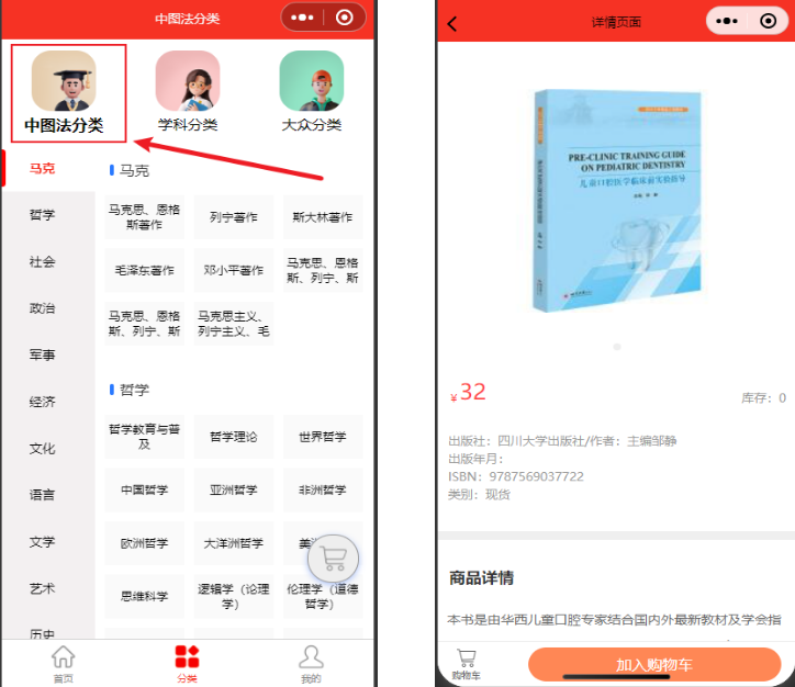 点击下方菜单栏“分类”,选择上方“中图法分类”,左侧子分类菜单栏则会对应更新,右侧即可看到对应图书。
