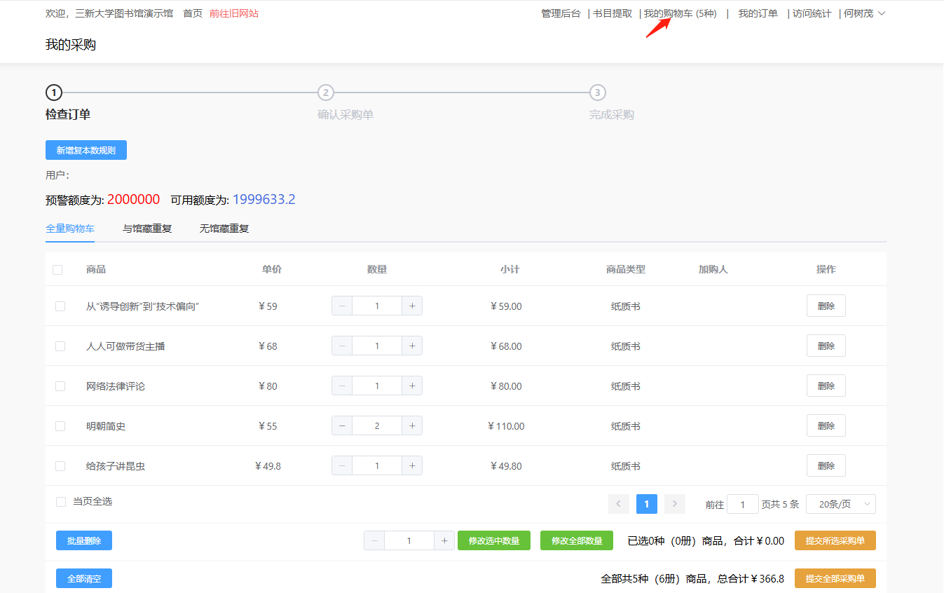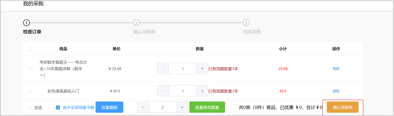 (3)确认采购单:✔全选,点击确认采购单,即可完成线上选购。