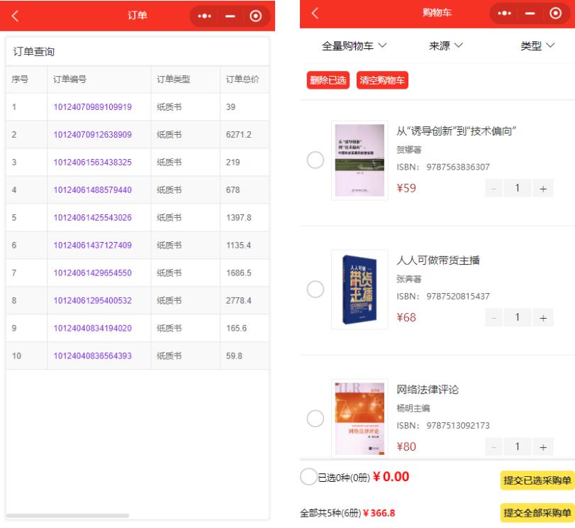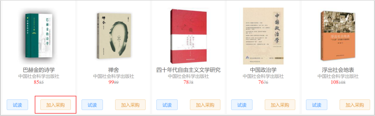 (1)加入采购:任意书单、分类界面点击进入书目列表页,点击将您心仪的图书加入采购;